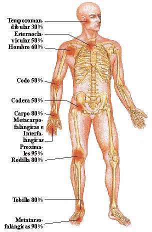 Representación de la frecuencia de articulaciones afectadas. Las más perjudicadas son habitualmente: carpo, metacarpofalángicas e interfalángicas proximales en el miembro superior, y rodilla, tobillo y metatarsofalángicas en el miembro inferior.