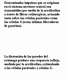 Otros estímulos producen, cerca de las células parietales, la secreción de histamina. Tanto la transmisión colinérgica, a través de la acetilcolina, como la gastrina y la histamina, convergen a nivel de una bomba secretora de iones hidrógeno (ATPasa K+ H+) en la cara luminal de la célula parietal. Por otra parte, el ión cloro (Cl-) proveniente del intercambio de iones a nivel de la membrana basal de la célula parietal y el sistema circulatorio adyacente permite que, junto con el hidrógeno H+, se forme el ácido clorhídrico (HCl). |