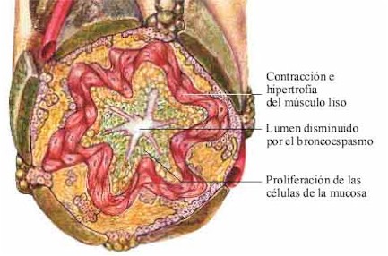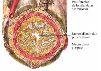 El asma puede definirse como una obstrucción potencialmente reversible de las vías aéreas con componentes de inflamación de la mucosa, acumulación de secreciones y cotracción de la musculatura bronquial. En las imágenes superiores de la derecha se destacan estos fenómenos que juegan un papel preponderante en el estrechamiento del lumen bronquial. |