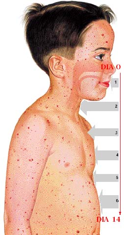 Después de un periodo de incubación de aproximadamente 14 días, que es asintomático, se presenta fiebre y malestar, que duran uno a dos días. Posteriormente comienza el periodo de estado, que se caracteriza por la aparición de lesiones a nivel de la piel y las mucosas. Este exantema es máculo-pápulo-vesiculo-costroso, y evoluciona por brotes; por eso se observa la mezcla de los elementos en una misma zona: se trata de un polimorfismo local y general. Cada brote se acompaña de un pico febril. La erupción progresa en forma cefalocaudal y confluye hacia el eje central, es decir, cumple la ley del máximo centrípeto. Las máculas evolucionan a costras que se desprenden a la semana; no deja cicatriz, salvo que se haya lesionado la membrana basal por rascado o sobreinfección.